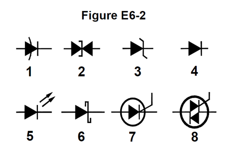 In Figure E6-2, what is the schematic symbol for a light-emitting diode?