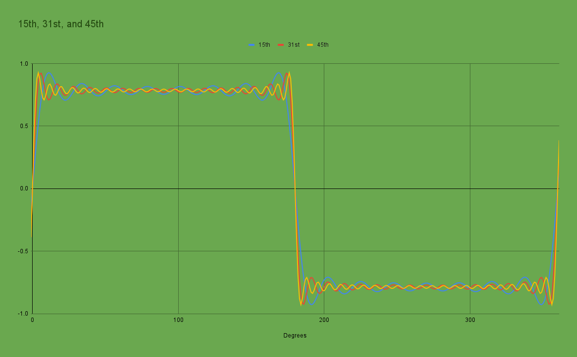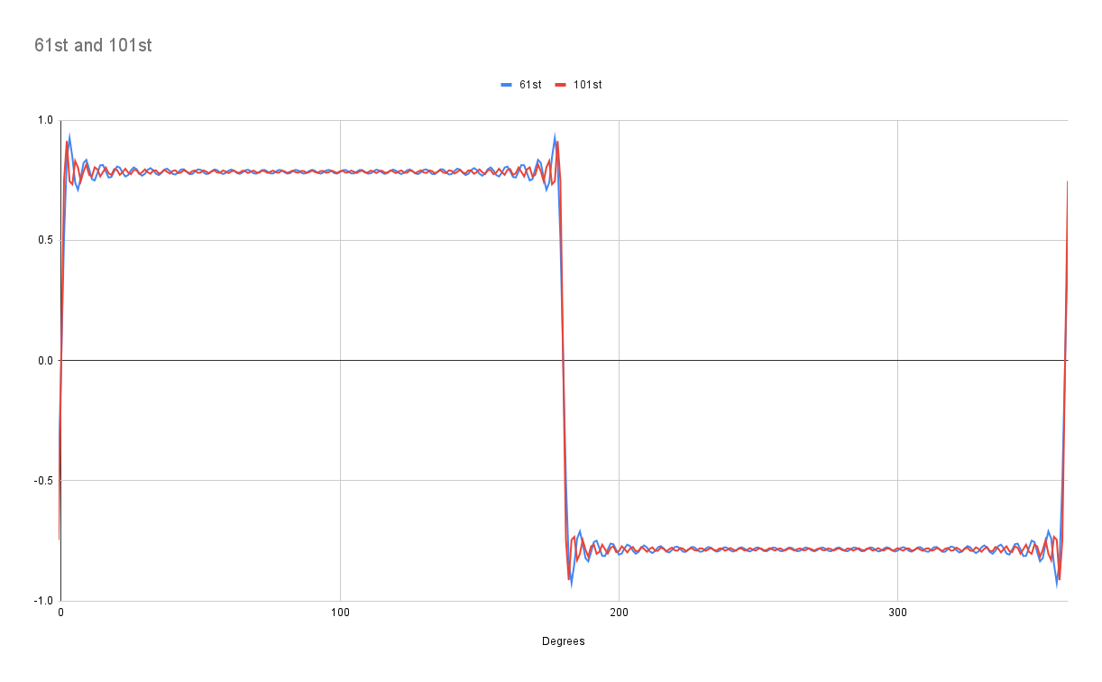 This graph showing that adding more and more odd harmonics makes a wave with a sharper rise and fall, and typically a flatter horizontal section. Going to 1001 harmonics makes a wave which appears totally flat, with just a small overshoot and over-recovery after the rise or fall, and a tiny wobble just before the change. A pure sinewave would rise less steeply than the blue line, and touch the 1.0 line.