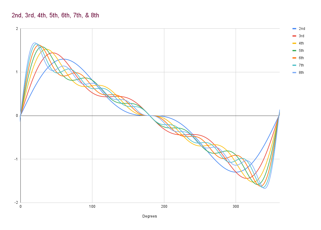 These show sawtooth waves with 2nd to 8th harmonics, and up to 21st and 36th harmonic. Close the new window when done, or switch back to this one.